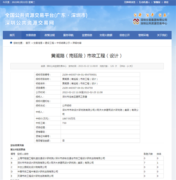 2022年2月22日,經深圳市公共資源交易中心中標公示通過,深圳市政院與同濟大學建筑設計研究院(集團)有限公司(聯(lián)合體)在深圳市龍崗區(qū)建筑工務署黃閣路(南延段)市政工程(設計)項目公開招標中成功中標,中標金額為1867.55萬元。