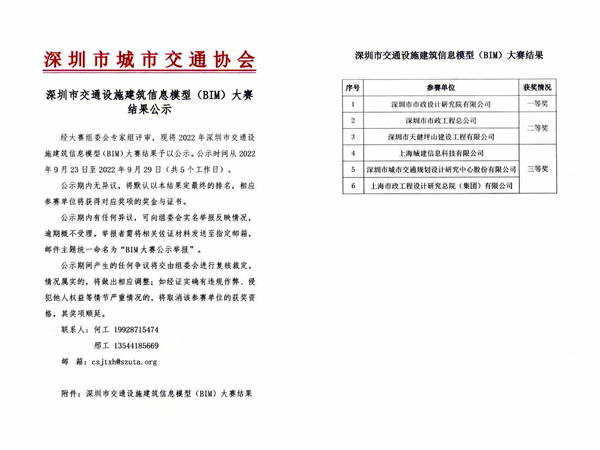 折桂!公司榮獲深圳首屆交通設(shè)施BIM大賽一等獎
