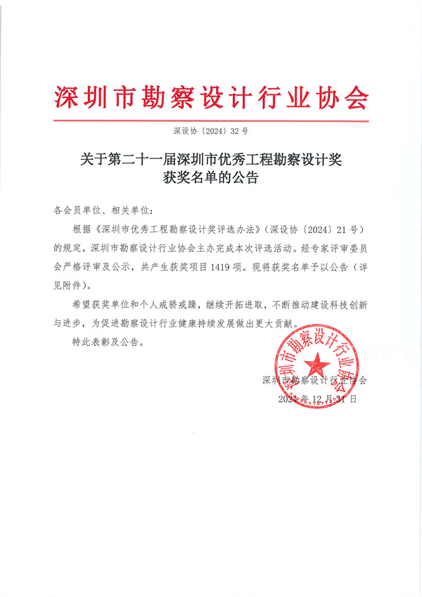 深圳市優(yōu)秀工程勘察設(shè)計(jì)獎(jiǎng)是深圳市工程勘察設(shè)計(jì)領(lǐng)域設(shè)立的最高榮譽(yù),旨在表彰和激勵(lì)在該領(lǐng)域做出杰出貢獻(xiàn)的個(gè)人和團(tuán)隊(duì)。該獎(jiǎng)項(xiàng)的頒發(fā)對(duì)于推動(dòng)深圳市乃至全國(guó)勘察設(shè)計(jì)行業(yè)進(jìn)步和技術(shù)創(chuàng)新具有重要意義。