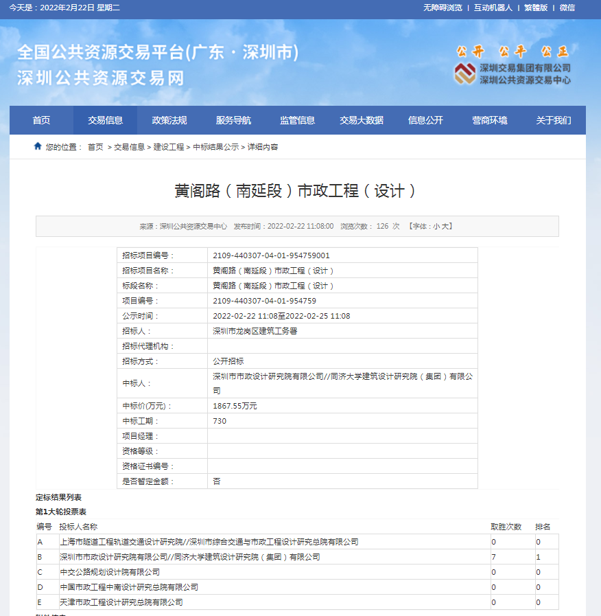 2022年2月22日,經(jīng)深圳市公共資源交易中心中標(biāo)公示通過(guò),深圳市政院與同濟(jì)大學(xué)建筑設(shè)計(jì)研究院(集團(tuán))有限公司(聯(lián)合體)在深圳市龍崗區(qū)建筑工務(wù)署黃閣路(南延段)市政工程(設(shè)計(jì))項(xiàng)目公開(kāi)招標(biāo)中成...
