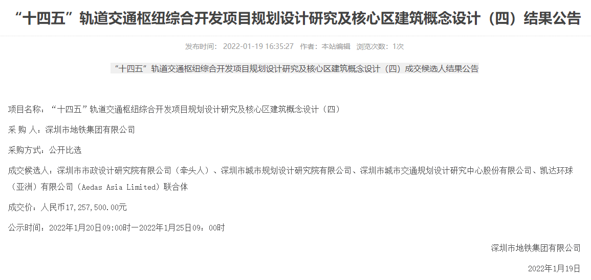 日前,經(jīng)深圳市地鐵集團(tuán)有限公司官網(wǎng)中標(biāo)公示通過(guò),深圳市政院軌道交通院作為聯(lián)合體牽頭方參投的“‘十四五’軌道交通樞紐綜合開(kāi)發(fā)項(xiàng)目規(guī)劃設(shè)計(jì)研究及核心區(qū)建筑概念設(shè)計(jì)(四)”喜獲中標(biāo),中標(biāo)金額...